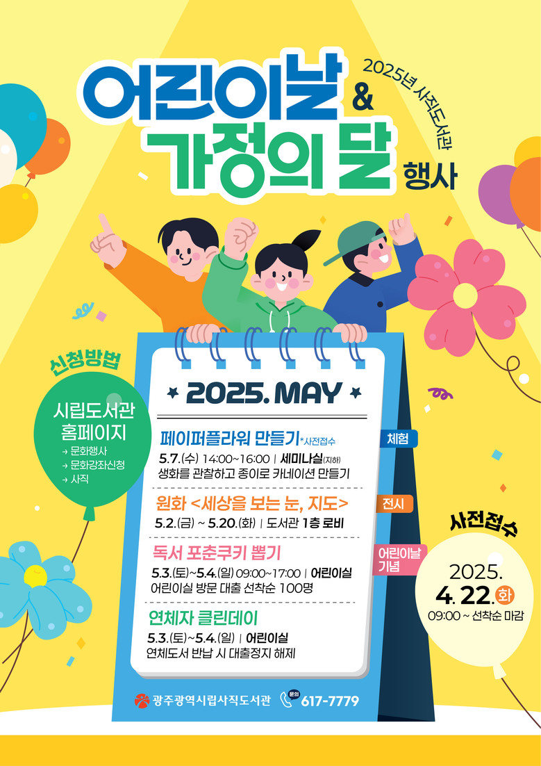 광주광역시립도서관은 5월 가정의 달과 어린이날을 맞아 5월 한 달간 지역 3개 도서관(무등‧산수‧사직)에서 어린이와 가족이 함께 즐길 수 있는 다채로운 문화 프로그램을 운영한다.