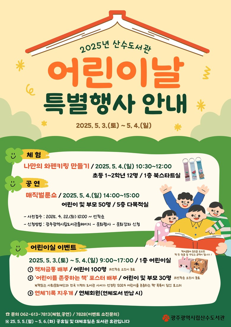 산수도서관은 ▲‘나만의 와펜 키링 만들기’ 체험(5월 4일) ▲매직벌룬쇼 공연(5월 4일)을 비롯해 5월 3일과 4일 ‘책저금통’과 어린이를 좋아하는 ‘책 포스터’를 배부한다. 연체기록 지우개 운영 등을 통해 어린이 눈높이에 맞춘 다양한 활동이 계획돼 있다.