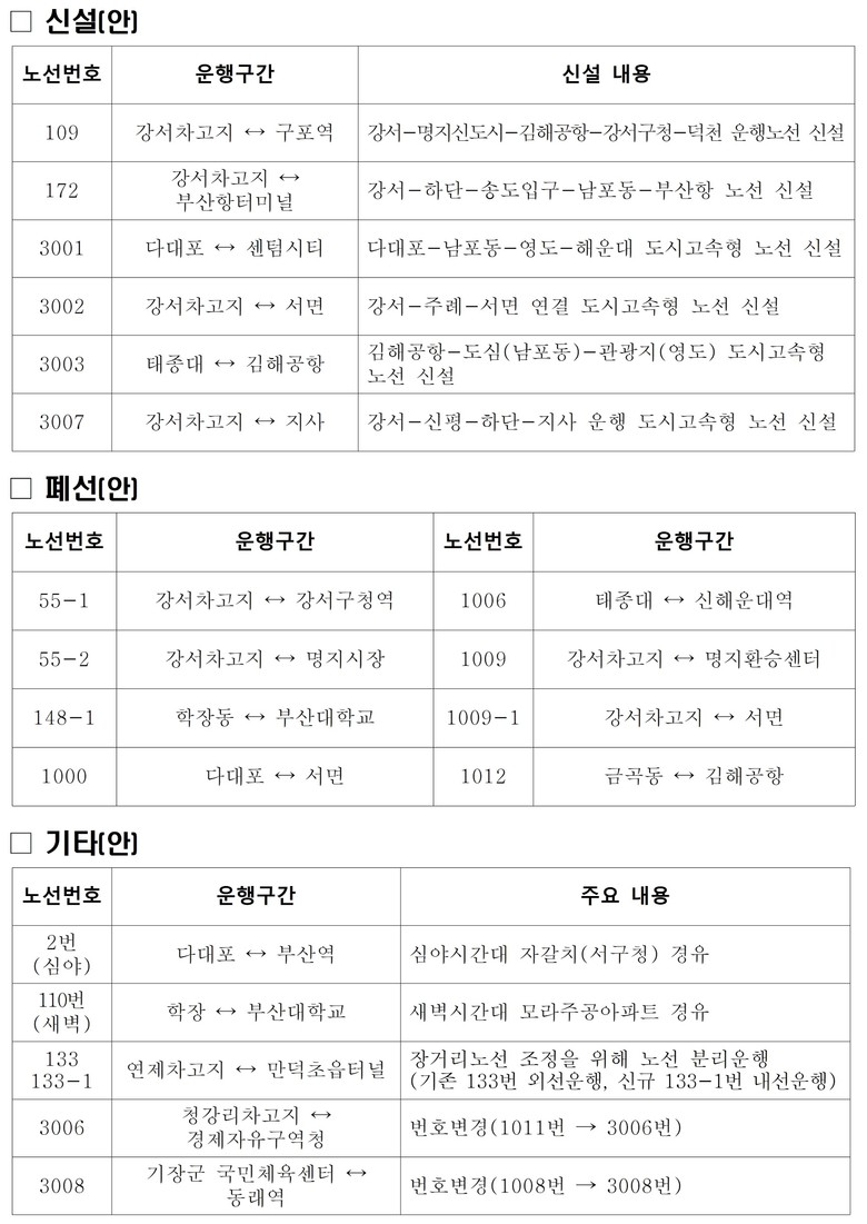 시는 이번 노선개편(안)에 ▲장거리(200분 이상) 단축 및 굴곡 개선 ▲도심과 외곽을 빠르게 연결하는 도시고속형 버스 신설 ▲신도시에 신규노선 공급 및 효율성 개선 ▲기장 오시리아, 강서 지역에 수요응답형 교통(DRT)을 확대 도입하는 내용의 사각지대 없고 빈틈없는 대중교통 서비스를 담았다.