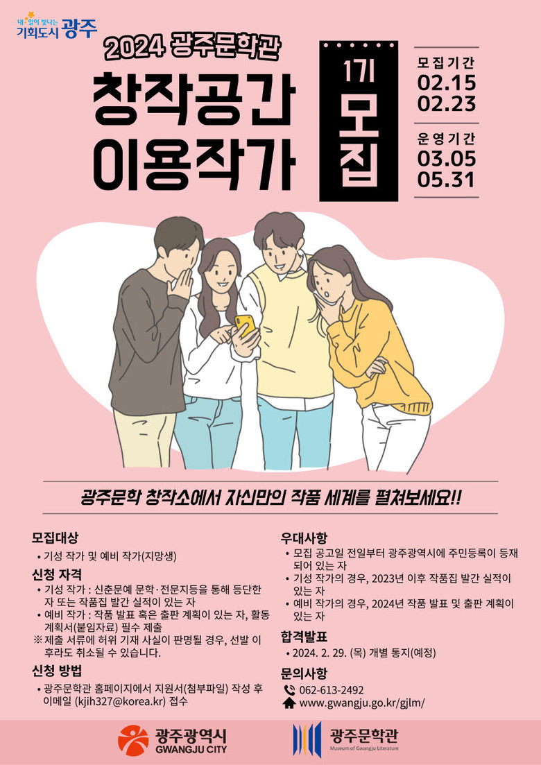 1기 참여 희망자는 23일 오후 6시까지 이메일(kjih327@korea.kr)로 신청하면 된다. 자세한 내용은 광주광역시 홈페이지 공고문을 통해 확인하거나 문학관운영팀(062-613-2492)으로 문의하면 된다.