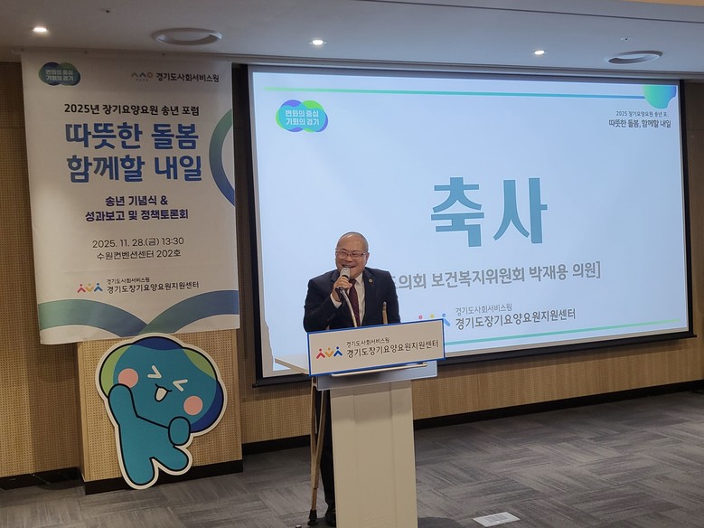 [경기도 세계타임즈=송민수 기자] 경기도의회 보건복지위원회 박재용 의원(더불어민주당, 비례)은 28일, 수원컨벤션센터에서 열린 ‘2025 장기요양요원 송년 포럼’에 참석해 장기요양요원의 처우개선과 지속가능한 돌봄 환경 조성을 위한 의회의 역할을 강조했다. 이번 포럼에는 경기도의회 보건복지위원회 김동규 의원(더불어민주당, 안산1)도 함께해 현장의 의견을 경청하고 장기요양 종사자들을 격려했다.
