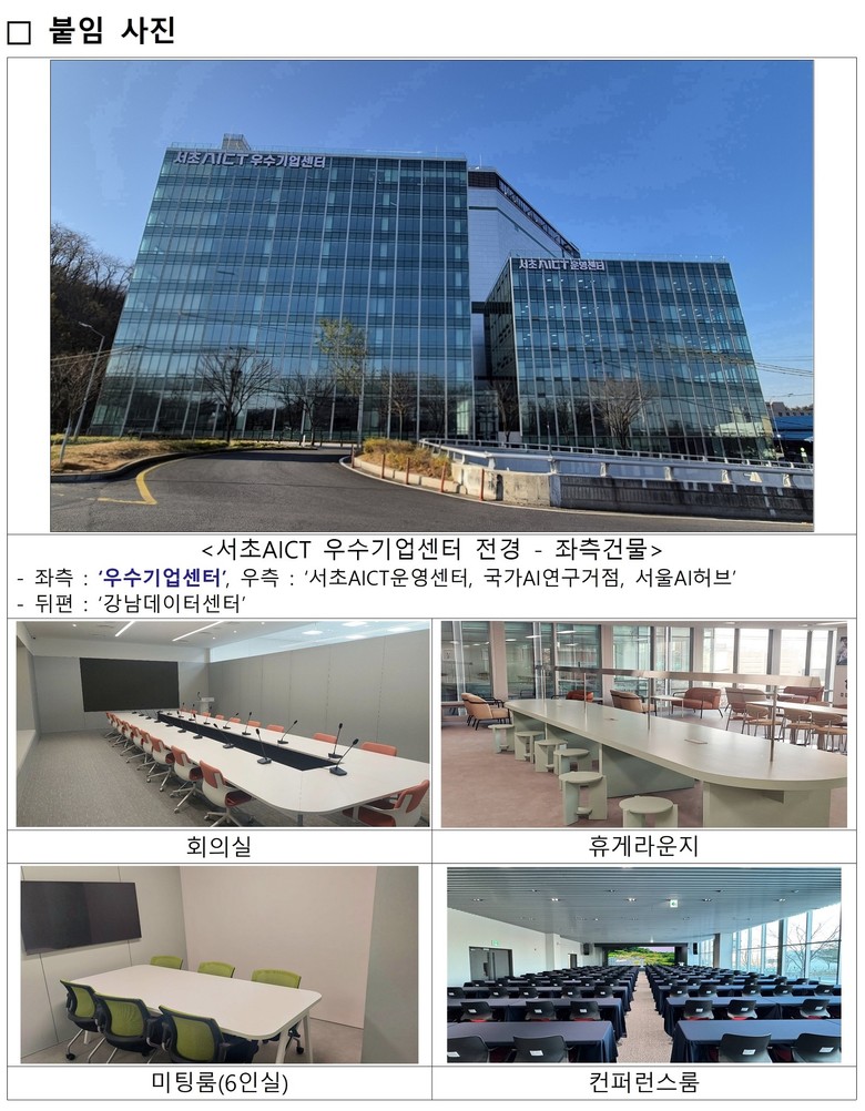 전성수 서초구청장은 “서초AICT 우수기업센터는 단순한 사무공간을 넘어 AI 기업의 스케일업을 실질적으로 지원하는 성장 플랫폼”이라며, “우수한 기술력과 성장 잠재력을 갖춘 AI 기업들의 많은 관심과 참여를 바란다”고 말했다.