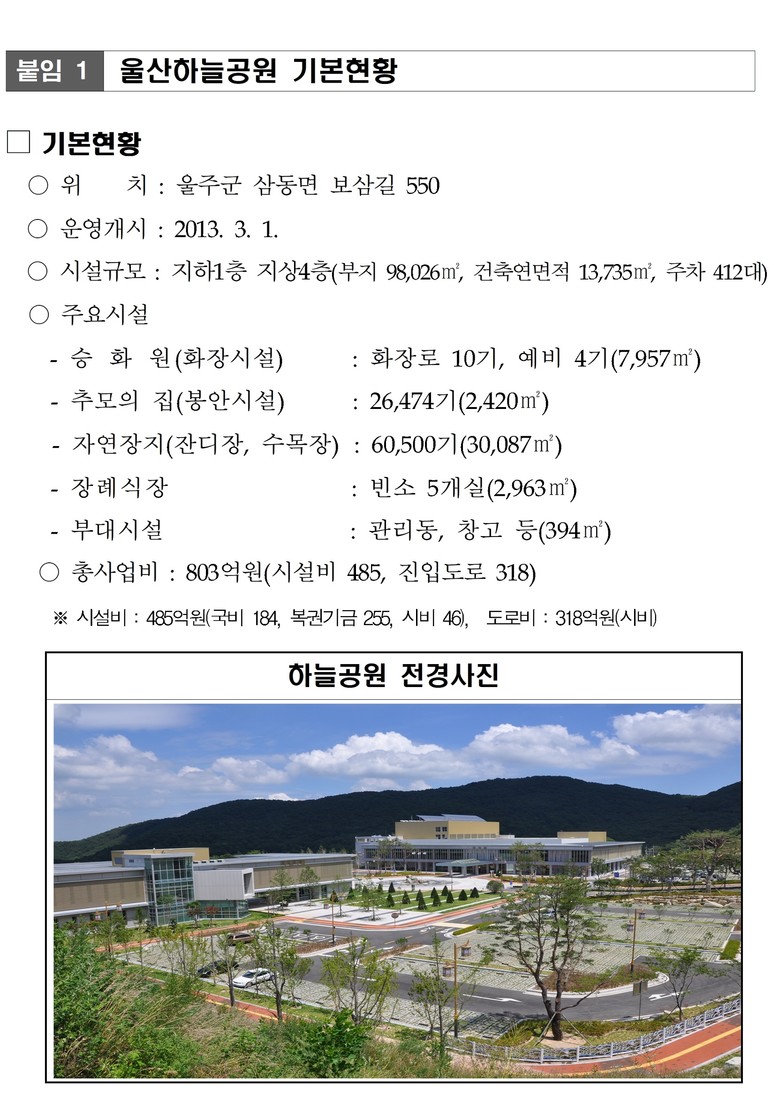 울주군 삼동면에 위치한 울산하늘공원은 울산 유일의 공영장사시설로 지난 2013년 개원 이후 올해 상반기까지 자연장지 이용 건수가 총 8,519건, 유택동산은 5,450건에 달한다.