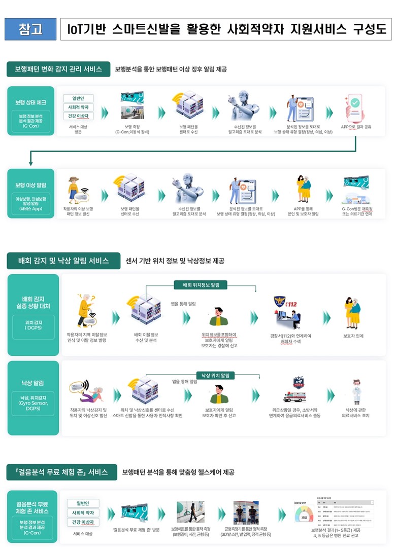 한편, '사물 인터넷(IoT)기반 스마트신발을 활용한 사회적약자 지원서비스 사업'은 65세 이상 고령자 500명을 대상으로, 보행 측정이 가능한 스마트센서(자이로센서-보행 분석, GPS센서-위치정보)가 부착된 스마트신발을 보급해 보행 패턴 변화를 관리하는 실증 서비스다.