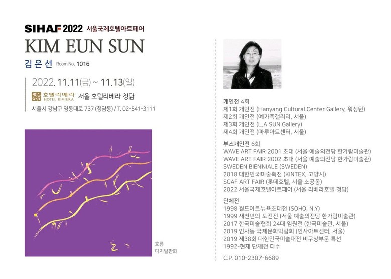 [세계타임즈 백진욱 기자] 2022년 11월 11일(금)부터 11월 13일(일)까지 진행하는 2022 서울국제호텔아트페어 행사에 김은선 작가가 서울시 강남구 영동대로에 위치한 서울 호텔리베라에서 작품전에 참가한다.