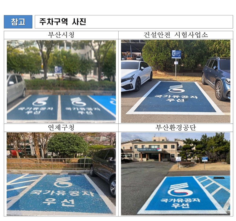 지난 2023년 제정된 「부산광역시 국가유공자 등 우선주차구역 설치 및 운영에 관한 조례」에 따라 국가유공자를 위한 우선주차구역 설치를 추진했으며, 올해(2025년) 6월 17일 기준으로 공공주차시설에 91면의 우선주차구역을 확보해 운영 중이다.