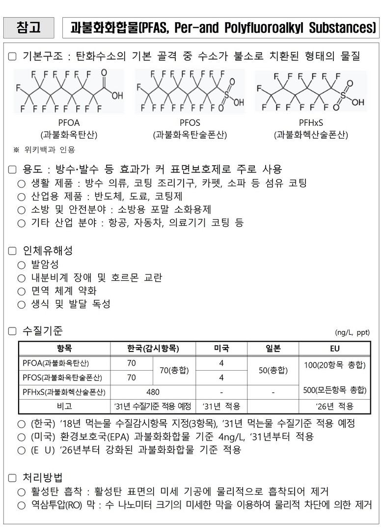 특히 자연 상태에서 거의 분해되지 않고 환경에 장기간 잔류하며, 물과 토양을 통해 광범위하게 확산되어 생물체에 축적될 수 있는 특성이 있어 상수도 공급 단계에서부터 철저한 관리와 선제적 대응이 필수적이다.