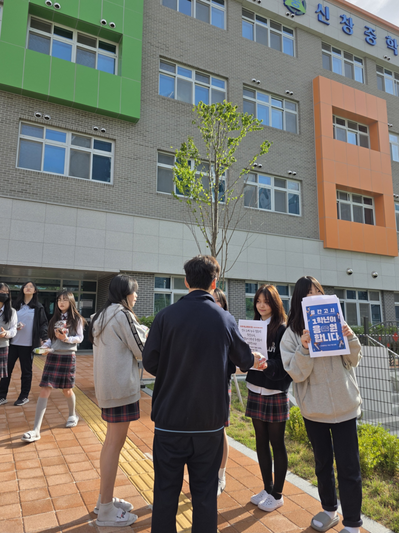[아산시 세계타임즈=이현진 기자] 충청남도 아산 신창중학교(교장 백재흠)는 4월 23일, 1학기 중간고사를 맞아 전교생을 대상으로 ‘중간고사 응원 꾸러미’ 나눔 캠페인을 운영했다. 이 캠페인은 자유학기제를 운영 중인 1학년 정·부반장 학생들이 자발적으로 기획·주도한 활동으로, 시험에 임하는 2·3학년 친구들에게 응원의 마음을 전하기 위해 마련되었다.