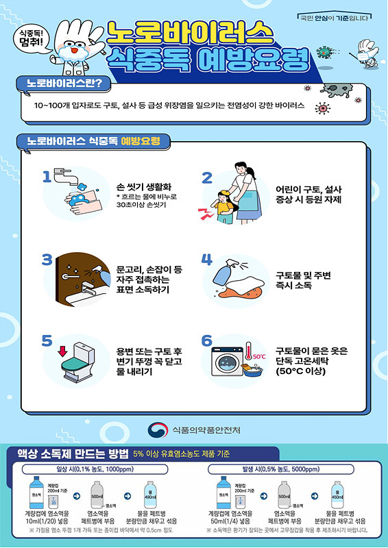 예방을 위한 주요 수칙으로는 ▲흐르는 물과 비누로 30초 이상 손씻기 ▲해산물은 85℃ 이상에서 1분 이상 충분히 가열 조리 ▲배변 후 변기 뚜껑을 닫고 물 내리기 ▲구토물 및 배설물 처리 시 일회용 장갑 착용 등이 있다.