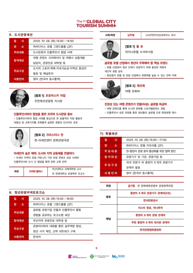 한편, 부산은 올해 7월 외국인 관광객 200만 명을 돌파하며 역대 최고치를 기록했다. 시는 이번 서밋을 통해 조기 300만 명 유치 달성은 물론, 아시아·유럽·아프리카 주요 도시를 잇는 글로벌 협력 플랫폼을 구축해 글로벌 관광산업의 새로운 전환점을 마련할 계획이다.