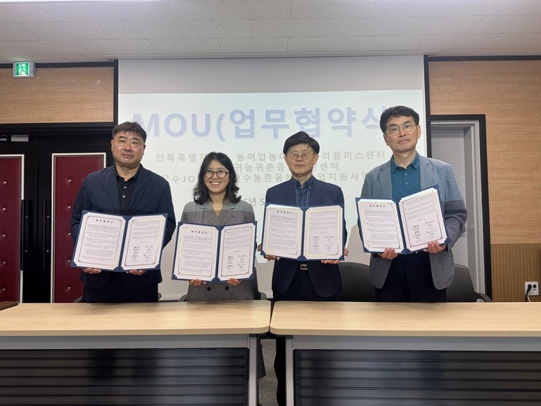 [세계타임즈=장수군 김서주 기자] 장수군귀농귀촌종합지원센터는 27일 전북특별자치도농어업‧농어촌일자리플러스센터를 비롯해 장수로컬job센터, 장수농촌융복합산업지원사업단과 함께 상호 협력적 연계를 통해 농어촌 활력 제고를 목표로 일자리 업무협약(MOU)을 체결했다.
