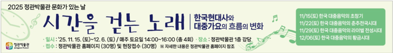 이번 강좌는 정관박물관 개관 10주년을 맞이해 기획한 성인 대상 교양 프로그램으로, 한국 현대사 속에서 대중가요의 변화 과정을 살펴보는 내용으로 구성되었다.