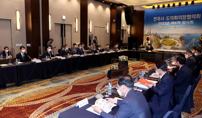 [광주=세계타임즈 손권일 기자] 전국시도의회의장협의회는 26일(수) 2021년도 제4차 임시회에서 광주광역시의회(의장 김용집)가 제안한 「지방재정법」 개정 건의안, ‘달빛내륙철도’ 국가철도 계획안 반영 촉구 건의안’ 2건을 채택했다.