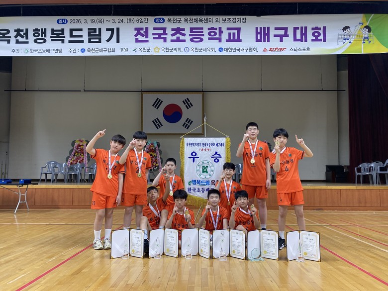 [부산 세계타임즈=이용우 기자] 부산 북구 금명초등학교(교장 신정훈) 배구부가 지난 3월 20일부터 24일 까지 충북 옥천에서 24개 초등학교가 출전한 가운데 열린 ‘제1회 옥천행복드림기 전국초등학교 배구대회’에서 남자초등부 우승을 차지했다.