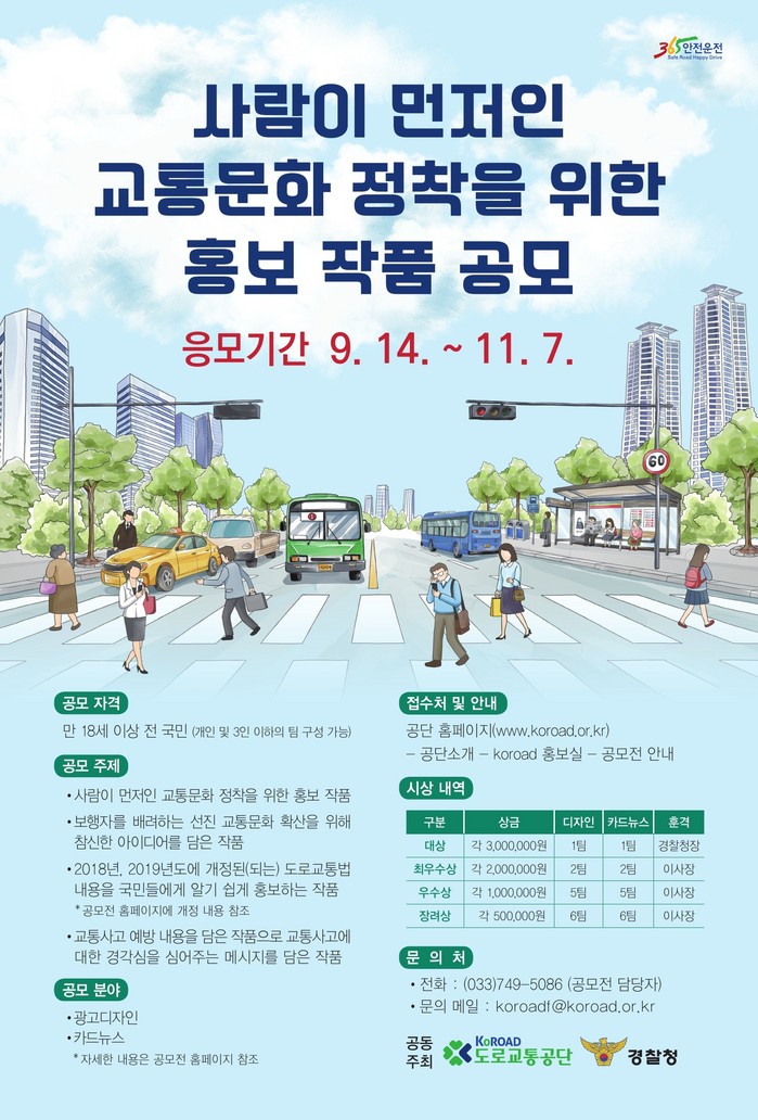 올해로 37회째를 맞이하는 교통안전 홍보작품 공모전은 올바른 교통질서 의식과 아름다운 선진 교통문화 정착을 위해 매년 진행하고 있으며, 공모 분야는 광고디자인과 카드뉴스로 18세 이상 누구나(개인 및 3인 이하의 팀) 참여할 수 있다.