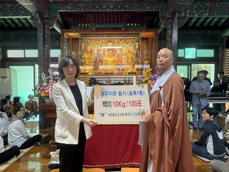 [동구 세계타임즈=한윤석 기자] 대한불교 조계종 통천사(주지 선지스님)는 지난 5일, 부처님 오신 날을 맞아 10kg 백미 100포(250만원 상당)를 대구 동구 효목1동 행정복지센터에 기탁했다.