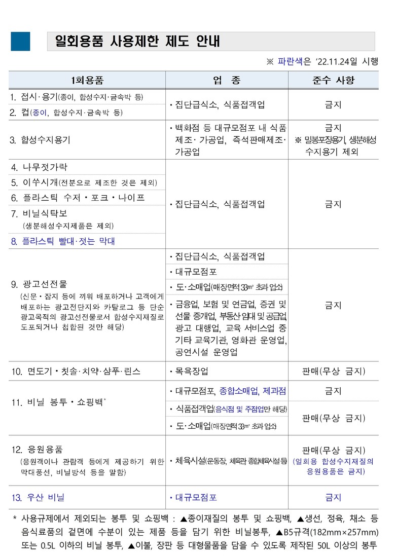 지난해 11월 자원재활용법 개정에 따라 1회용품 사용제한 품목이 종이컵, 플라스틱 빨대⸱젓는 막대, 우산 비닐이 추가되며 21개 품목으로 확대됐다. 또 1회용 봉투·쇼핑백, 응원용품의 무상제공 금지에서 사용 금지로 준수사항이 강화됐다. 확대⸱강화된 제도는 1년간 계도기간을 운영 중이며, 계도기간이 끝나는 11월 24일자로 1회용품 사용 적발 때 과태료가 부과된다.