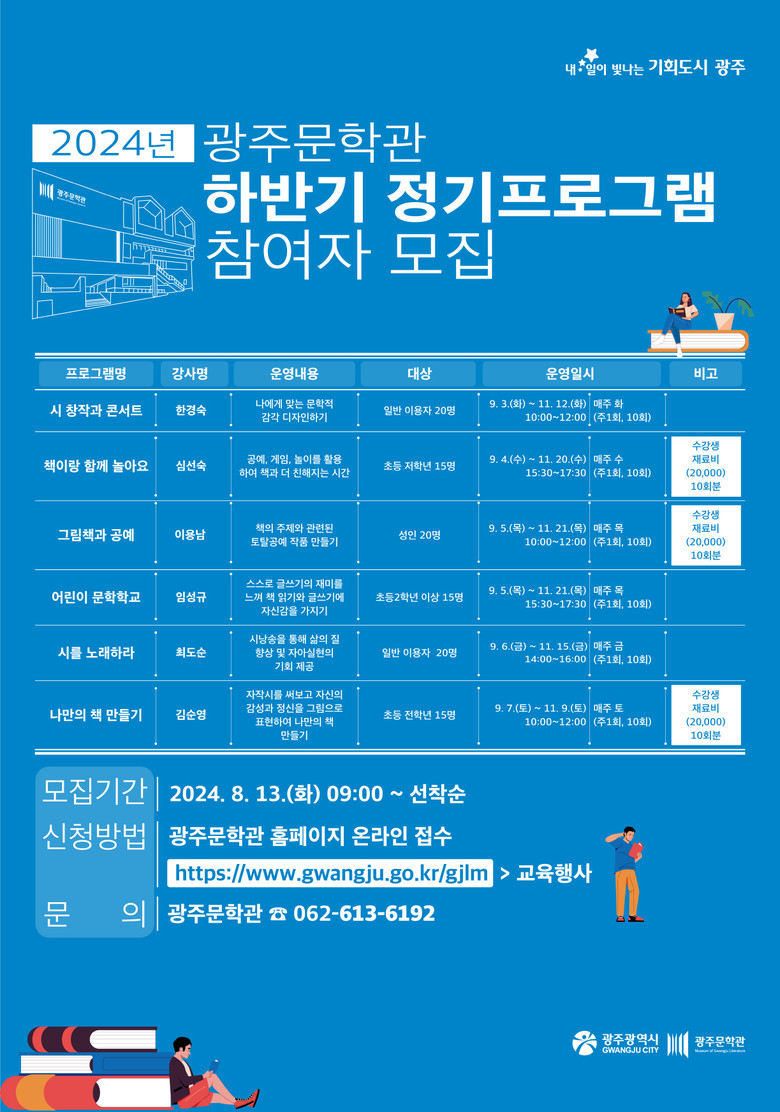 자세한 내용은 광주문학관 누리집을 통해 확인하거나 문학관 운영팀(062-613-6192)으로 문의하면 된다.