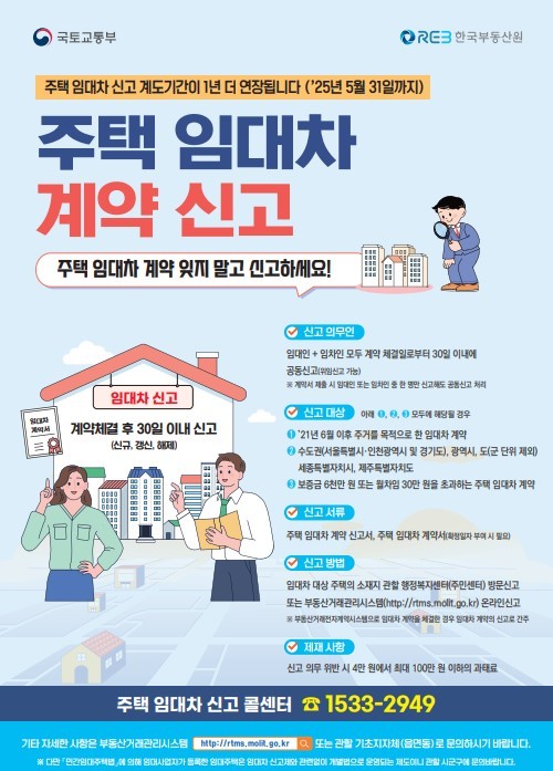 주택 임대차 계약 신고 대상은 2021년 6월 1일 이후 체결된 임대차 계약 건으로 보증금 6000만원 또는 월세 30만원을 초과하는 주택 임대차의 신규·변경·해지 계약 등이며 계약금액이 변동 없는 갱신계약은 신고하지 않아도 된다.