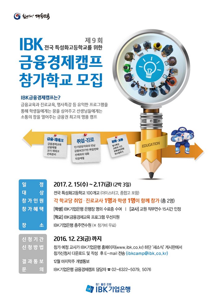 또 참가 학생에게 기업은행장 명의의 캠프 수료증이, 교사에게는 1학점(15시간)의 교원 직무연수학점이 부여된다.