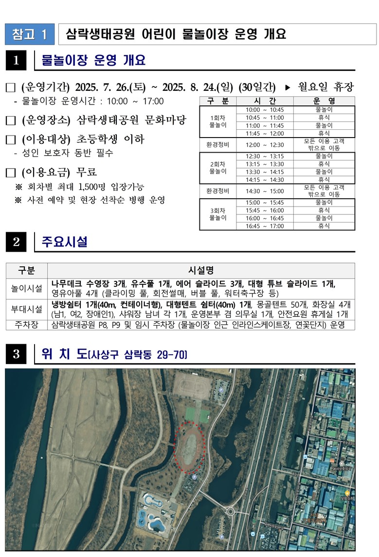 물놀이장의 운영시간은 ▲1회차, 오전 10시~ 12시 ▲2회차, 오후 12시 30분 ~ 2시 30분 ▲3회차, 오후 3시 ~ 5시며, 매주 월요일은 휴장한다.