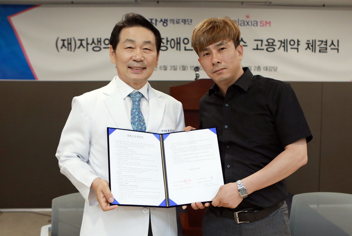 | ▲자생의료재단 박병모 이사장(왼쪽)과 장애인 선수단 대표 장성호 선수가 근로계약 체결 후 사진 촬영을 하고 있다. |