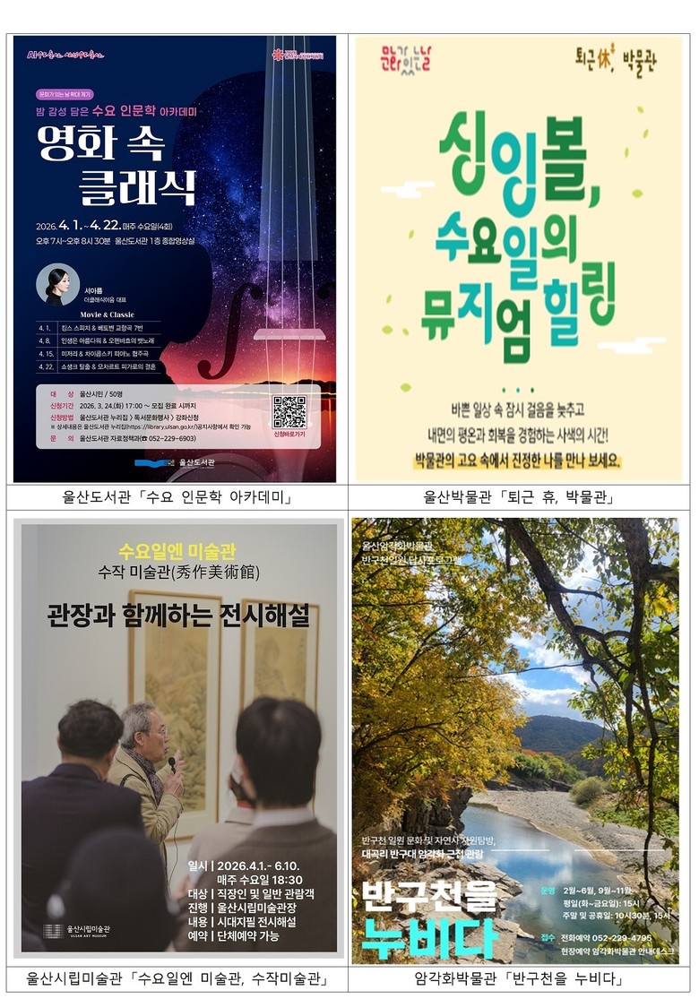 울산시는 ‘문화가 있는 날’ 확대 시행에 맞춰 지역 박물관·미술관·도서관 등 공공시설 45개소에서 전시, 공연, 체험 등 다양한 프로그램을 운영한다.