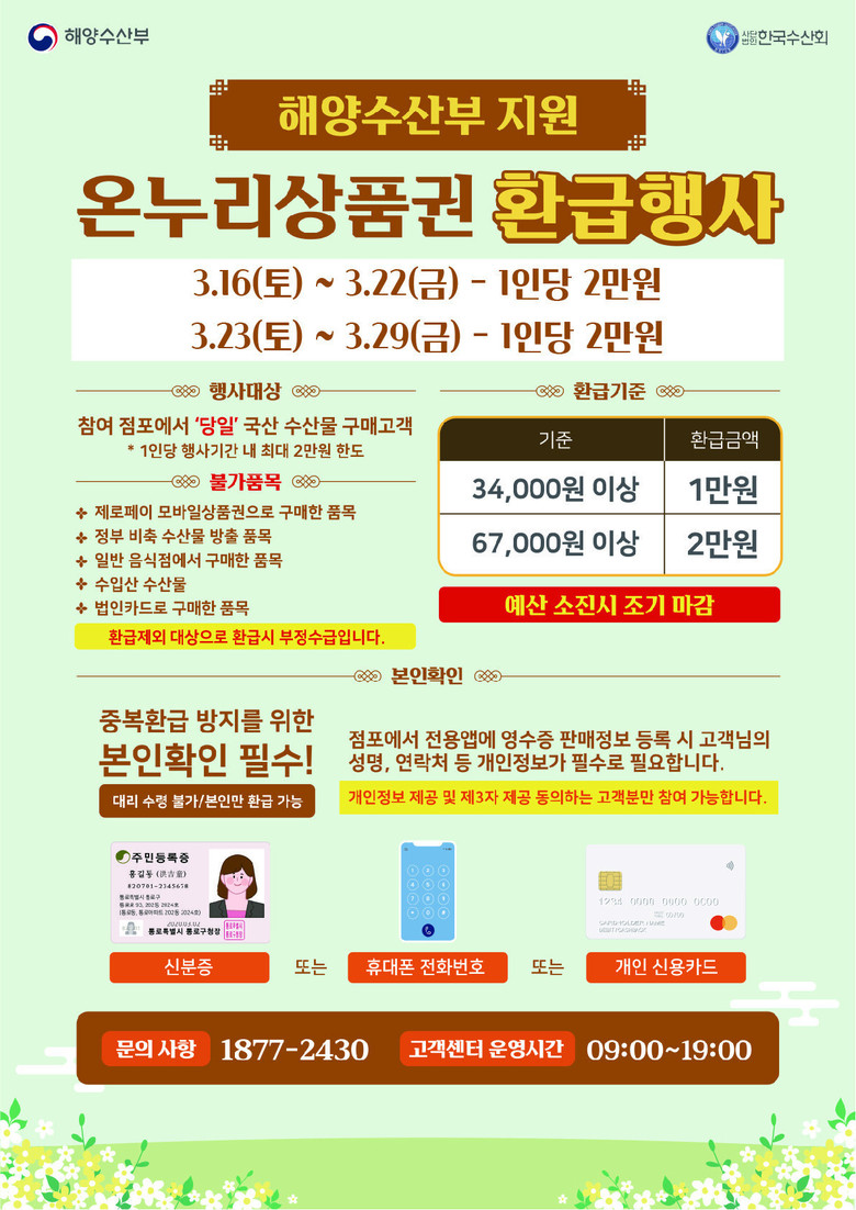환급대상은 국산 수산물 또는 국내산 수산물 원재료 비중이 70% 이상인 단순가공품이다. 당일 구매금액이 3만4000원 이상~6만7000원 미만이면 1만원, 6만7000원 이상 2만원을 온누리상품권으로 환급받을 수 있다.