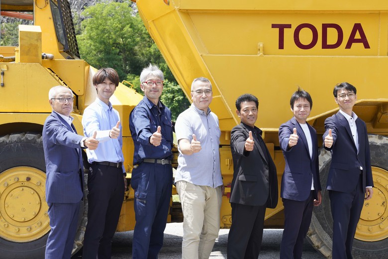 (새안이 개발한 30톤급 굴절식 전기 덤프트럭은 매연이 배출되지 않아 탄소중립 문제를 해결했다. (왼쪽부터) 미야자키 타츠야 일본TD리스 고문, 노로 코다이 도다중기철공주식회사 과장, 하타케야마 치카라 도다중기철공주식회사 과장, 그리하라 사토시 새한재팬 대표, 요시무라 미키오 일본 TD리스 본부장, 아마리 히로유키 아마리코주식회사 대표, 최병길 ESS테크노코리아 부장)