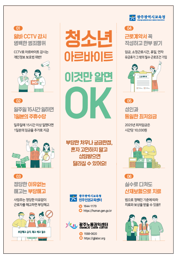특히 포스터 하단에 시교육청 민주인권센터, 광주노동권익센터 상담원 연락처도 포함돼, 노동인권 침해 사례 발생 시 즉각적이고 실제적인 도움을 받을 수 있도록 구성됐다.
