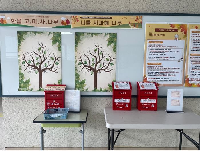 또한 애플데이(10월24일)와 연계한 ‘한울 고.미.사.나무’ 행사는 친구, 선생님, 학교 직원분 등 고맙고 미안하고 사랑하는 마음을 담아 사과 카드에 편지를 쓰는 활동을 진행하였다. 이를 통해 서로 간의 우정이 피어나는 행복한 학교 분위기를 조성한다는 목적이며, 사과편지는 추후 3층게시판에 전시할 예정이다.