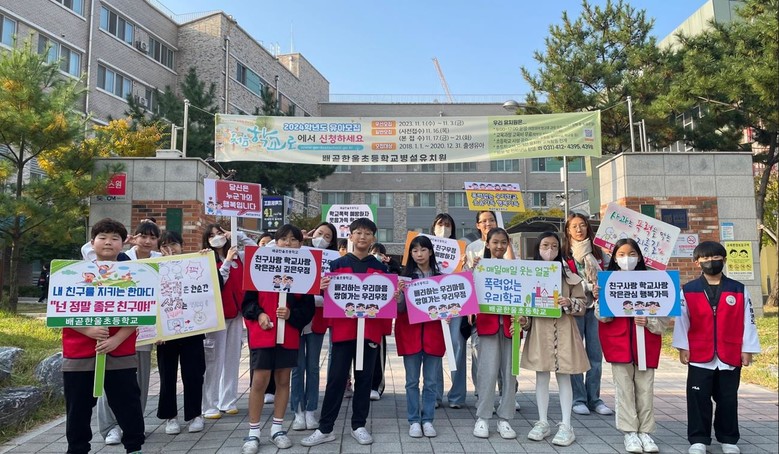 ◦ 학교폭력예방주간을 맞이한 학교폭력예방 캠페인 시행 [시흥시 세계타임즈=송민수 기자] 경기 시흥시 배곧한울초등학교는 10월 23일부터 10월 27일을 학교폭력예방주간으로 정하고 전학년을 대상으로 학교폭력예방 활동 프로그램을 운영하였다.