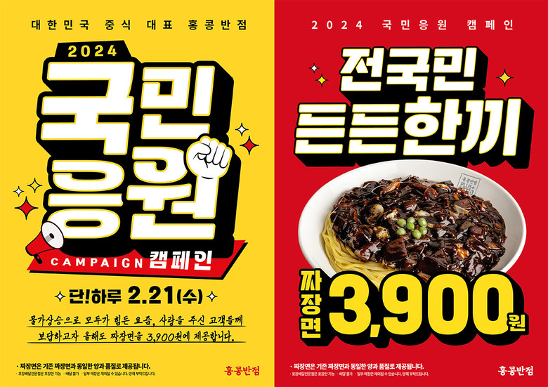 장기간 지속되는 고물가 기조로 모두가 힘든 요즘, 홍콩반점은 지난 18년간 받아온 고객들의 사랑과 성원에 보답하고자 합리적인 가격으로 든든한 한 끼 식사를 즐길 수 있도록 작년에 이어 올해도 국민응원 캠페인을 기획했다.