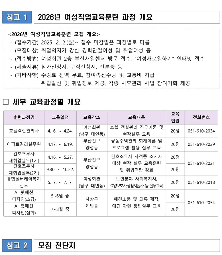 접수 일정은 과정별로 상이하며, 자세한 사항은 여성회관 교육복지팀(☎ 051-610-2012) 또는 부산새일센터(☎ 051-610-2018)로 문의하면 된다.