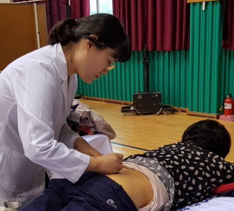 | ▲자생한방병원 의료진이 단양군 주민에게 침치료를 실시하고 있다. |