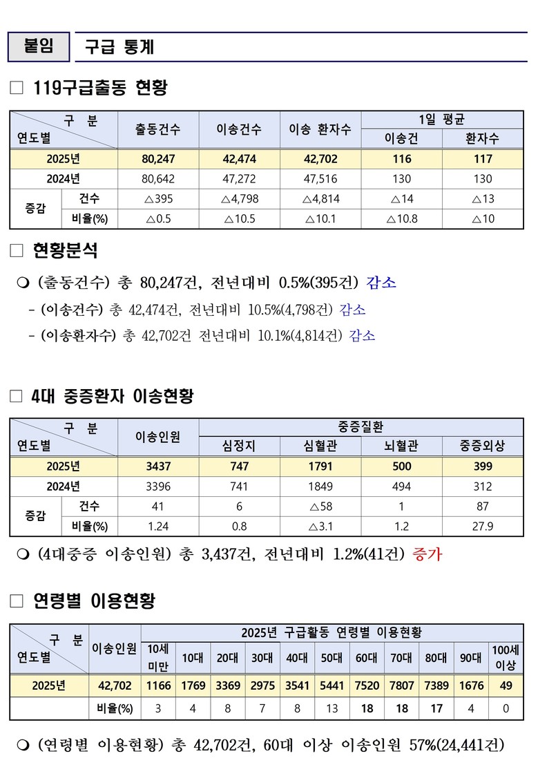 이어 “앞으로도 중증환자와 고령층을 중심으로 현장 대응의 정확도와 구급 서비스의 질을 지속적으로 높여 나가겠다”라고 밝혔다.