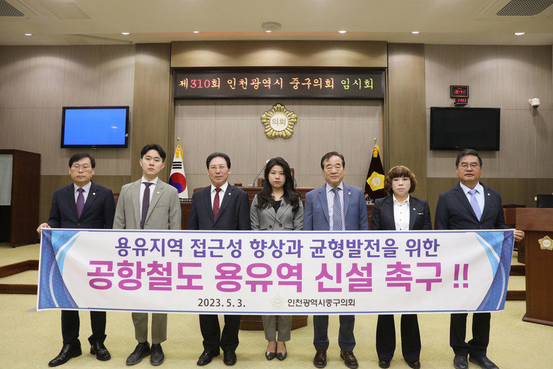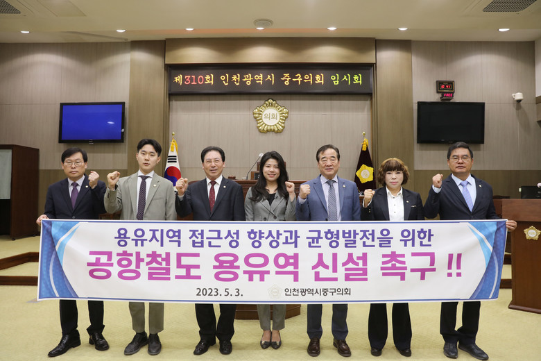 [중구 세계타임즈=심하린 기자] 인천 중구의회(의장 강후공)는 5월 3일 제310회 임시회 제4차 본회의에서 의원 전체가 공동발의한 ‘공항철도 용유역 신설 촉구 결의안’을 의결했다.