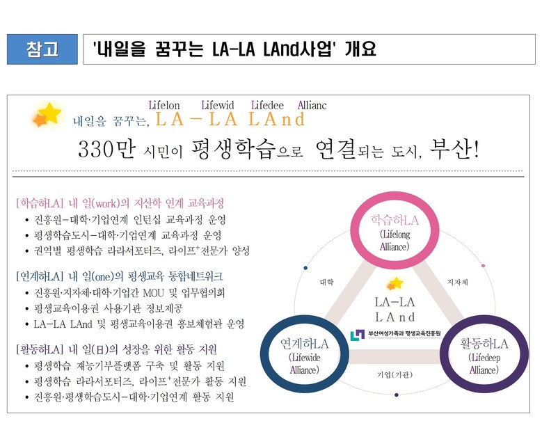 부산시민이 꿈꾸는 다양한 내일(work·one·日)을 위한 ‘내일을 꿈꾸는 라라 랜드(LA-LA LAnd) 사업’으로 ▲[학습하라(LA)] 내 일(work)의 지·산·학 연계 교육과정 운영 ▲[연계하라(LA)] 내 일(one)로 만들기 위한 통합 네트워크 활성화 ▲[활동하라(LA)] 부산시민의 내일(日)의 성장을 위한 활동 지원 등 다양한 세부 사업을 추진할 계획이다.
