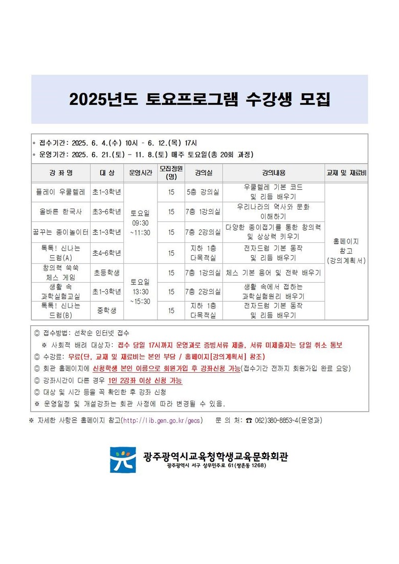 자세한 내용은 광주학생교육문화회관 누리집 또는 운영과(062-380-8853~4)로 문의하면 된다.