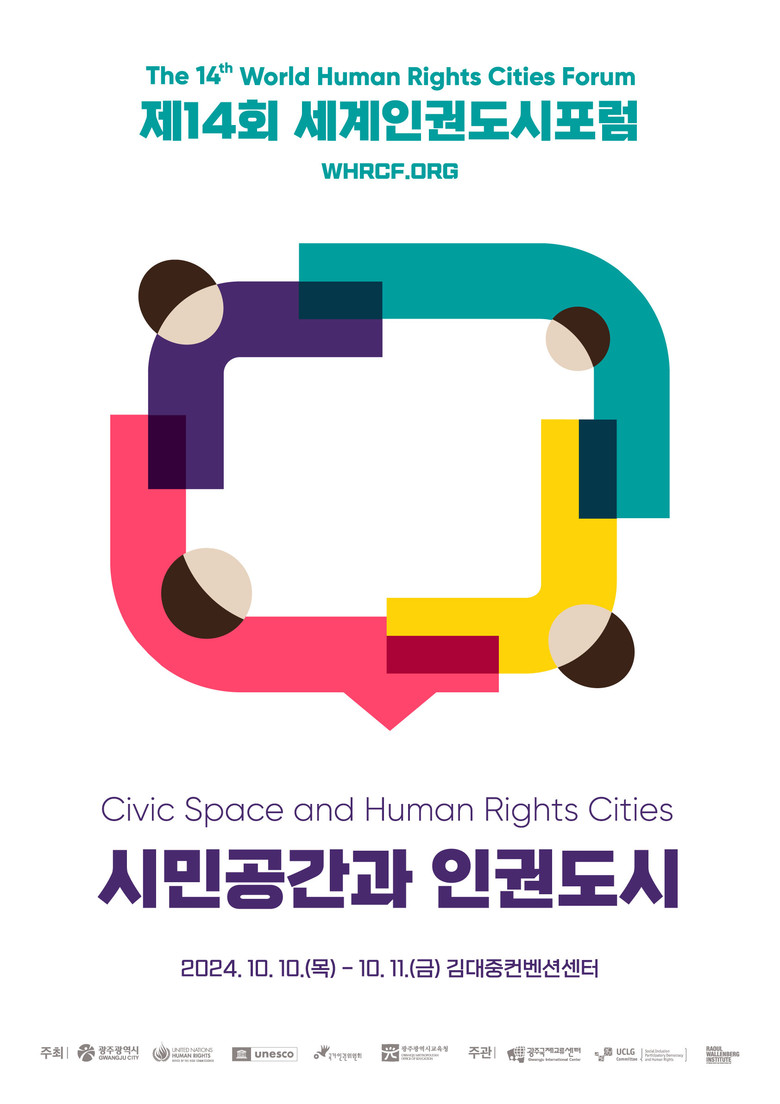 제14회 세계인권도시포럼의 공식포스터는 다양한 시민이 어우러져 협력을 통해 의견을 표출하고 소통하는 ‘말풍선’의 이미지로 시민공간을 표현, 시민공간 보호와 확장을 위해 노력하는 따뜻한 인권도시를 표현했다.