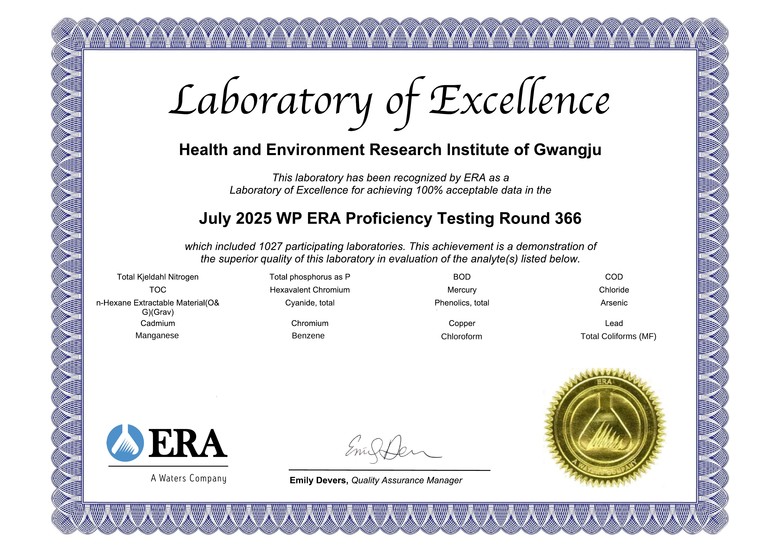 광주보건환경연구원은 이번 성과로 10년 연속 국제 숙련도시험에서 우수한 평가를 이어가며, 일관된 품질관리 체계와 세계적 수준의 분석능력을 재확인했다. 매년 자발적으로 시험에 참여해 정확성과 공신력을 검증받고 있으며, 시민의 신뢰 확보를 위한 체계적 노력을 지속하고 있다.