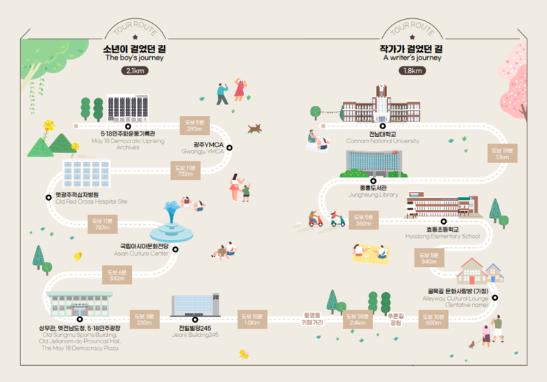 소년이 걸었던 길은 ‘5‧18민주화운동기록관~광주YMCA~옛광주적십자병원~ 국립아시아문화전당~상무관, 옛전남도청, 5‧18민주광장, 전일빌딩245’ 등으로 이어진다. 작가가 걸었던 길은 ‘골목길 문화사랑방(가칭), 효동초등학교, 중흥도서관, 전남대학교’ 등으로 이어진다.