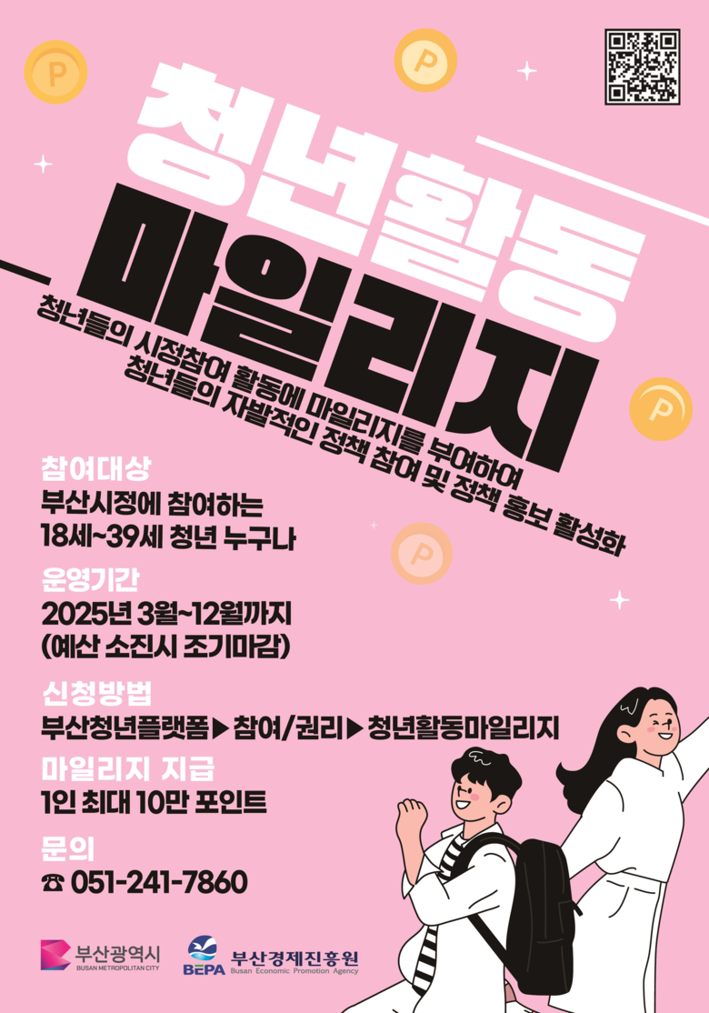 김귀옥 시 청년산학국장은 “청년활동마일리지 제도를 통해 청년의 자발적인 시정 참여를 장려하고 정책 홍보를 활성화하고자 한다”라며, “청년들이 부산의 시정에 더욱 적극적으로 참여할 수 있도록 지속해서 제도를 개선하고 확대해 나갈 것”이라고 전했다.