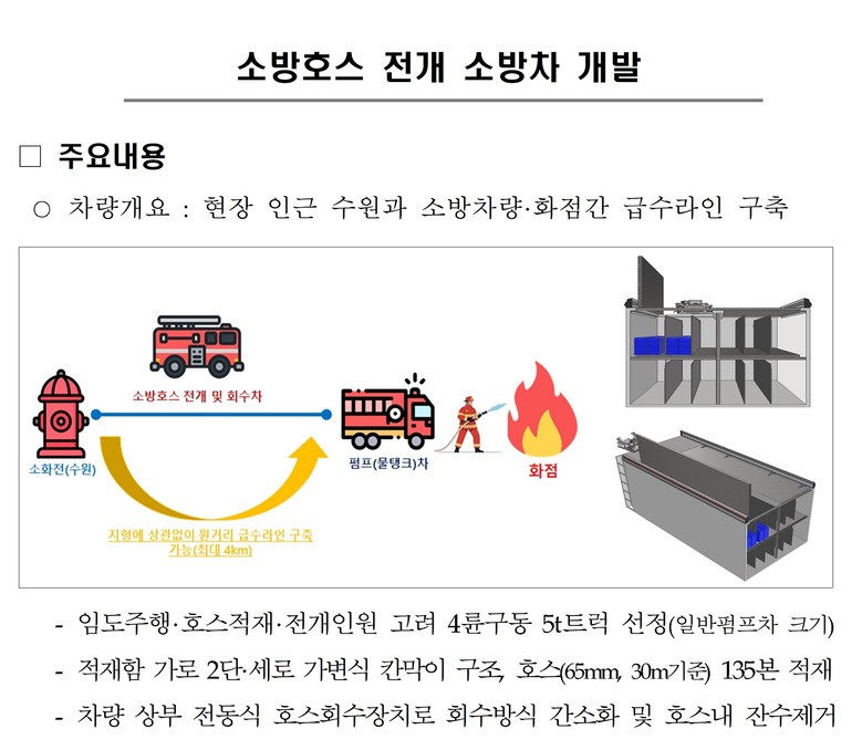제안된 ‘소방호스 전개 소방차’는 4륜 구동 5톤 트럭(일반 펌프차 규모)을 기반으로 제작되며, 적재함 내부를 가변식 구조로 설계해 소방 호스(65mm×30m 기준) 135본을 적재할 수 있다.