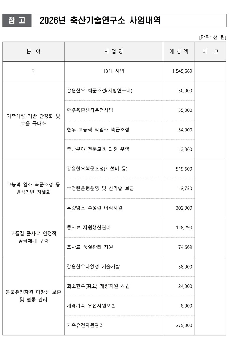 2026년 시험·연구사업은 총 15억 원 규모로, ▲번식기반 차별화 ▲동물유전자원 보존·관리 ▲풀사료 자원 생산·관리 ▲가축개량 및 현장 지원·교육 등 4개 분야 13개 사업을 추진한다.