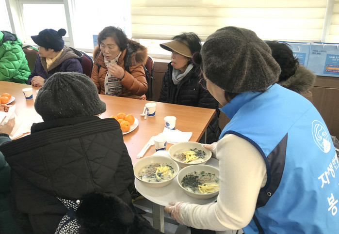 | ▲자생한방병원 봉사단이 잠실 지역 어르신들을 대상으로 떡국 나눔 행사를 진행하고 있다. |