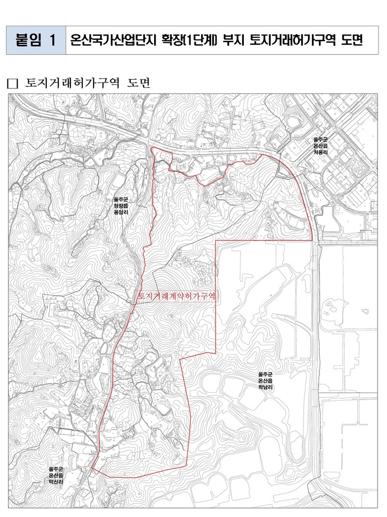 울산시 관계자는 “‘온산국가산업단지 확장(1단계) 개발사업’ 추진에 따른 지가 상승 기대심리와 투기적인 거래 발생이 우려됨에 따라 지가안정을 통한 사업의 원활한 추진을 위해 토지거래허가구역으로 지정하게 됐다”라고 말했다.