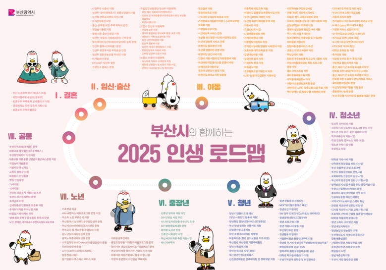 ◈ 특히, '부산시와 함께하는 2025 인생 로드맵' 페이지를 통해 생애주기의 흐름에 따라 지원받을 수 있는 인구정책을 쉽게 파악할 수 있도록 구성