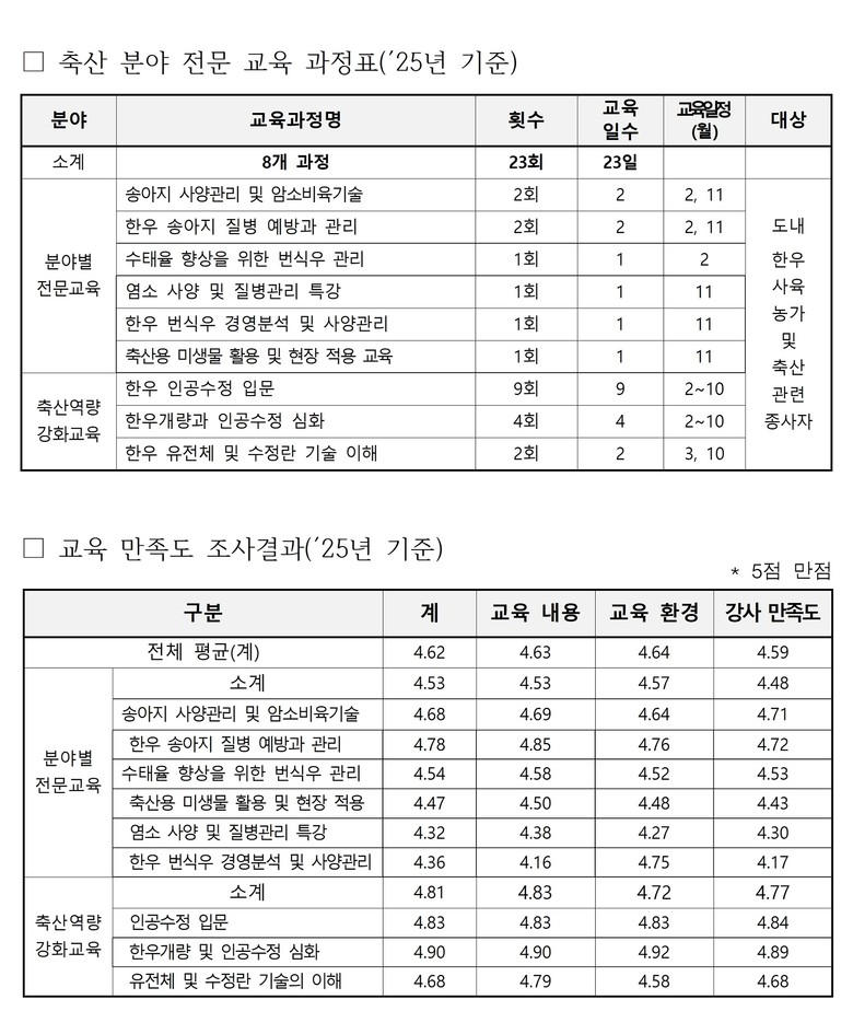 또한 교육 종료 후 교육 내용·운영 방식 개선을 위한 설문조사를 실시했으며, 2026년에는 설문 결과를 바탕으로 농가 수요 기반 교육과정 확대, 현장 실습 중심의 실천형 교육 강화, 기타가축·스마트 축산 등 분야별 신규 과정 신설을 통해 교육 체계를 더욱 내실화할 계획이다.