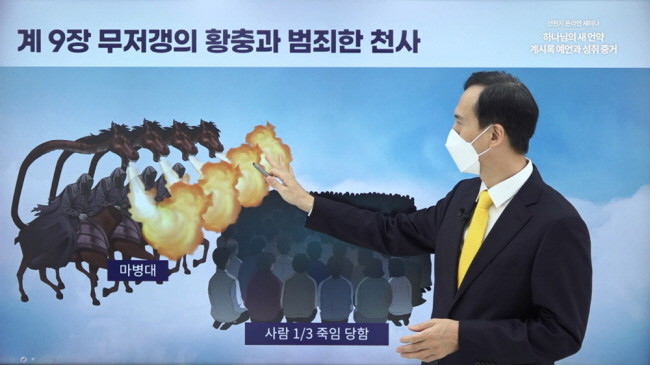 [세계타임즈 백진욱 기자] 신천지 예수교회(신천지 예수교 증거장막성전, 총회장 이만희)에서 ‘하나님의 새 언약 계시록 예언과 성취 증거’ 세미나로 성경의 마지막책 예언서인 요한계시록(1~22장)에 대한 실상 증거를 이어가는 가운데, 이승주 시몬지파장이 8일 계시록 9장 강의를 이어갔다.